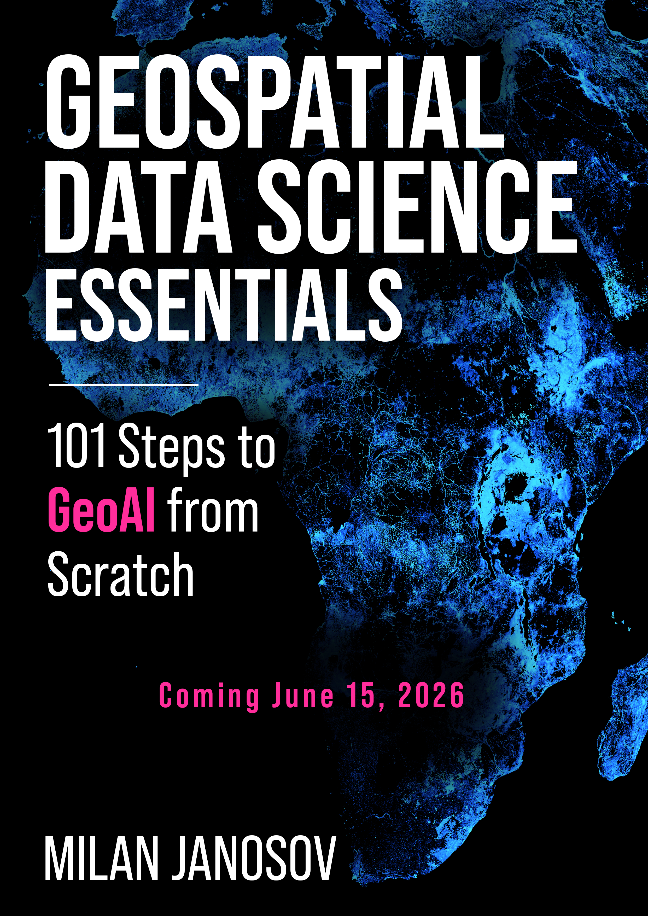Three books on data science, networks, and the modern geography of place. Geospatial Data Science Essentials and Connecting the Dots are available now. GeoAI Essentials launches June 2026.
